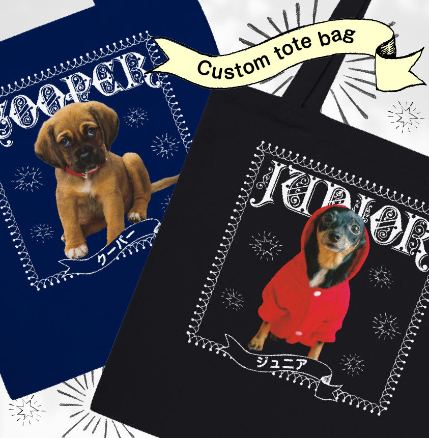 ペットの名前は日本語に変換!JAPOPOPN STUDIOデザイナーのオリジナルデザイン!ペットの写真と名前でオリジナルのCustomデザイントートバッグを作りましょう!